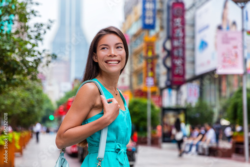 © Maridav, Obraz premium Chinka na zakupy w mieście Nanjing Road Szanghaj, Chiny. Szczęśliwa dziewczyna spaceru jednym z najbardziej ruchliwych deptaków na świecie. Azjatyckie kobiety turystyczne odwiedzające sklepy. Słynny punkt orientacyjny chińskiej atrakcji.