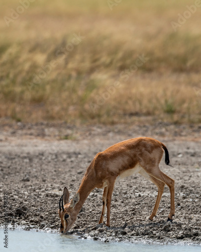 © Sourabh, Obraz premium Chinkara or Indian gazelle or Gazella bennettii an Antelope close up or portrait drinking water quenching thirst from waterhole in safari natural green at ranthambore national park rajasthan india