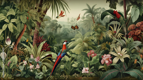 Fototapeta premium Chinoiserie wallpaper depicting a bird on a tree with small flowers based on generative AI