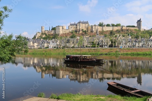 © Florence Piot, Fototapeta premium Chinon, panorama sur la ville et son reflet sur la Vienne, avec des bateaux (France)