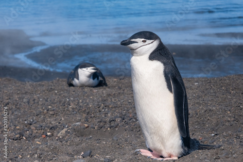 Fototapeta premium Chinstrap and Gentoo penguins hanging around the warm waters and steam of the...
