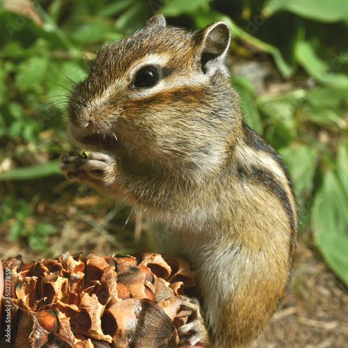 Obraz premium Chipmunk extracts and eats nuts from a pine cone