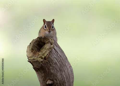 © Ana Varona, Obraz premium Chipmunk hidden behind a trunk looking to the camera.