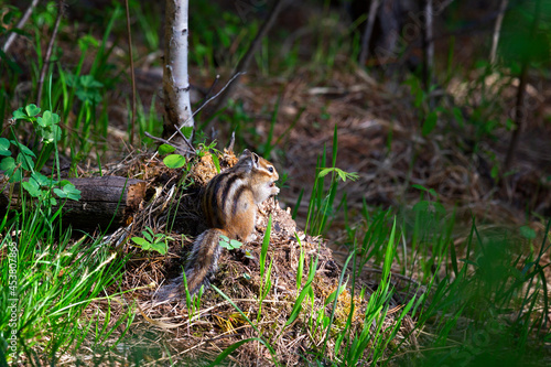 © Shchipkova Elena, Obraz premium Chipmunk on a forest trail eating something