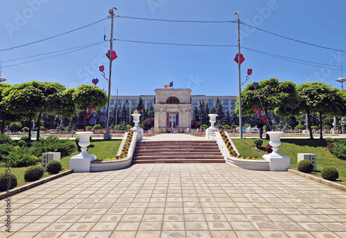 © psychoshadow, Fototapeta premium CHISINAU, MOLDOVA Triumphal Arch as popular historical landmark of the capital with the Moldovan Government House in the background