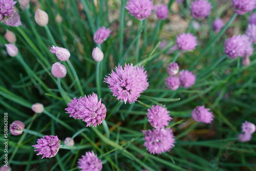 Fototapeta premium Chive flowers growing in a garden.