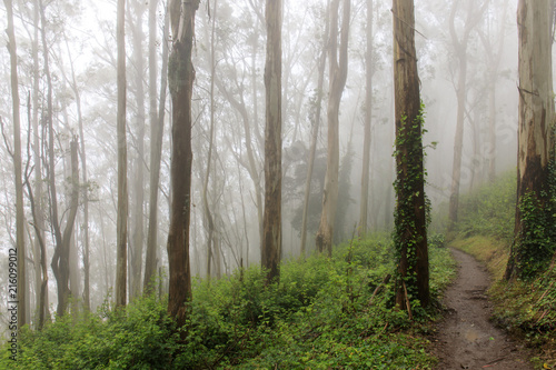 © Yuval Helfman, Fototapeta premium Chmura lasu eukaliptusowego. Letnia mgła wiejąca w Mount Sutro Open Space Preserve, San Francisco, Kalifornia, USA.