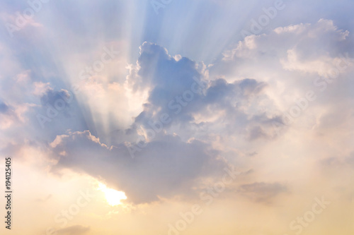 © nicemyphoto, Obraz premium Chmury i słońce świeci przez promienie światła na oświetlonym malowniczym niebie.
