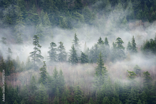 © LoweStock, Fototapeta premium Chmury lasów tropikalnych w północno-zachodnim Pacyfiku. Chmury schodzą na jodłowo-cedrowym lesie nad Harrison Lake w Kolumbii Brytyjskiej w Kanadzie.