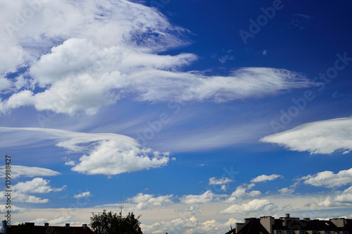 © W Korczewski, Fototapeta premium Chmury na błękitnym niebie nad budynkami mieszkalnymi.