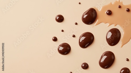 © itol, Fototapeta premium Chocolate and caramel drips on beige background, food photography, dessert