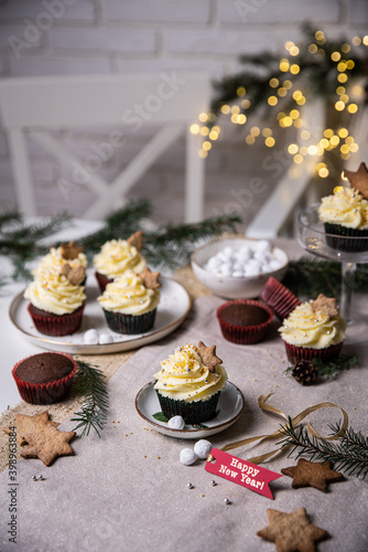 © Sofiia.Popovych, Naklejka premium Chocolate and cherry cupcakes with mascarpone frosting and gingerbread cookies on festive table with bokeh lights on background.