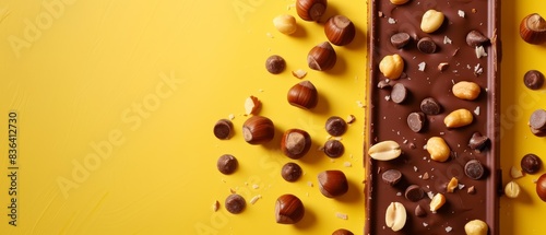 Fototapeta premium Chocolate Bar with Nuts and Cocoa on Yellow Background, Gourmet Dessert Treat, Crunchy and Aromatic, Copy Space