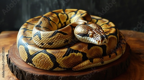 © Dmitriy, Obraz premium chocolate cake on the table in the shape of a tree python constrictor, on a wooden tray, banner