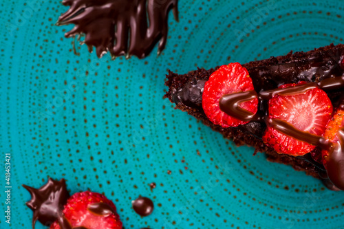 Naklejka premium chocolate cake with strawberries in turquoise dish