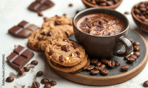 Fototapeta premium Chocolate chip cookies and a cup of hot chocolate on a black texture...