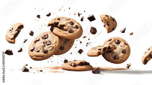 © Suparto, Obraz premium Chocolate chip cookies falling over white background