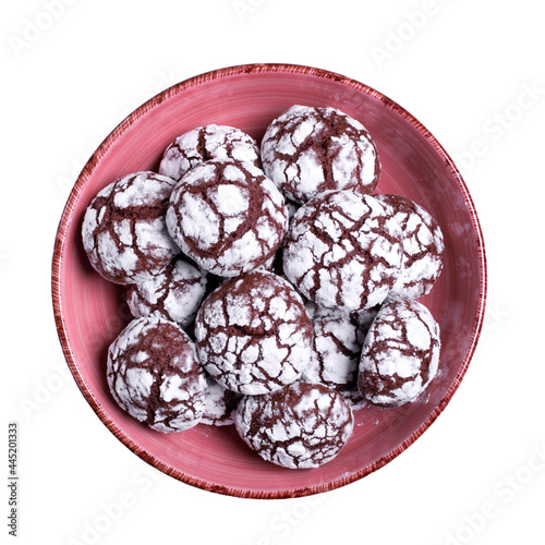 Fototapeta premium Chocolate crinkle cookies in the ceramic bowl isolated on white