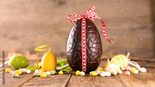 Naklejka premium chocolate easter egg with red ribbon