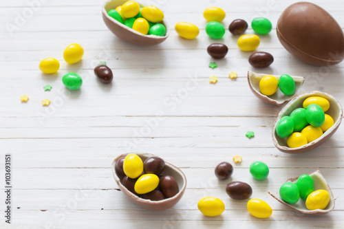 © Maya Kruchancova, Obraz premium Chocolate Easter Eggs Over Wooden Background