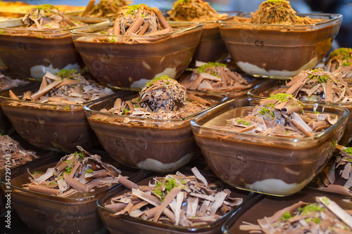 Fototapeta premium Chocolate mousse pudding in portion glasses on stack one over another