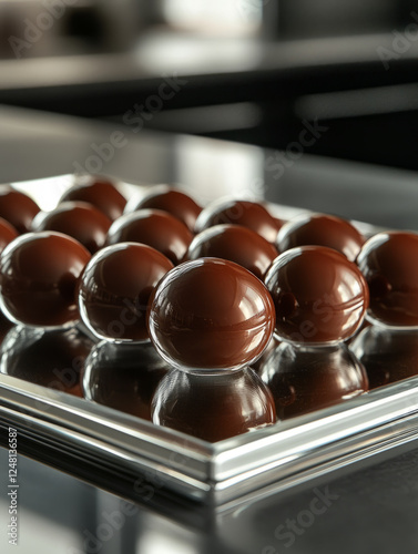 © SashaMagic, Obraz premium Chocolate spheres on a reflective surface.