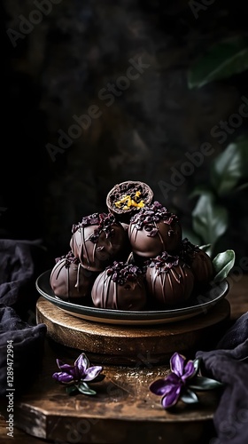 Fototapeta premium Chocolate truffles with a spicy chili and orange zest filling.