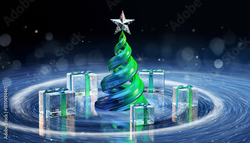 © tomo81, Naklejka premium Choinka na Boże Narodzenie z gwiazdą na czubku i prezentami