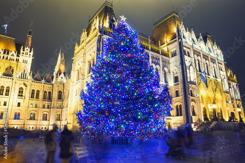 © Ilgov, Fototapeta premium Choinka przed budynkiem Parlamentu, przy placu Kossuth