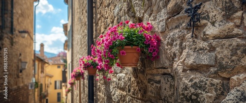 Obraz premium Choosing garden elements: Hanging flower pots accentuate textured walls and create a distinctive landscape