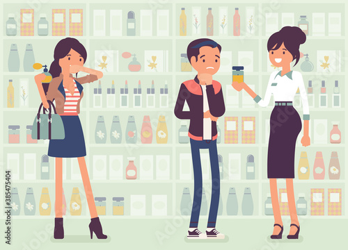 © andrew_rybalko, Fototapeta premium Choosing perfume, finding fragrance in a store with female sales assistant. Man puzzled with sample scents. Vector creative stylized illustration, beauty product shelf display background, full length