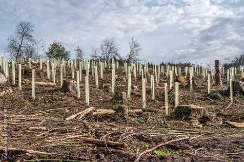 © CL-Medien, Fototapeta premium chopped Woodland new plantation Germany replanted with new sapling deciduous trees protected with plastic tubes