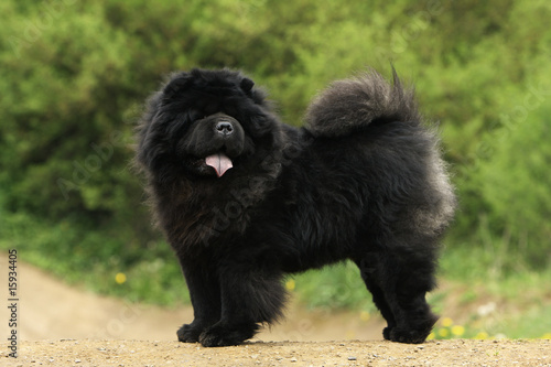 © Dogs, Fototapeta premium chow-chow noir debout au milieu d'un chemin - tête tournée