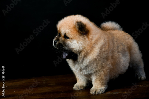 © iamaimmy, Obraz premium Chow Chow puppies on a wooden table in a black background