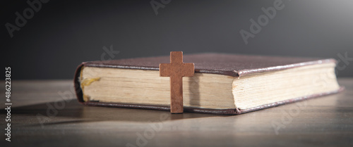 © andranik123, Obraz premium Christian cross and Bible on the wooden background.