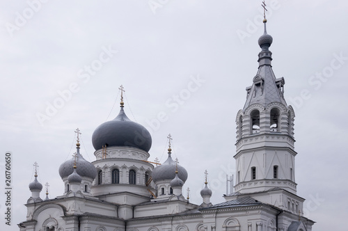© Oksana, Obraz premium Christian orthodox white church with silver and grey domes with gold crosses. Calm grey sky above