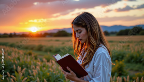 © Nattapun, Fototapeta premium Christian woman praying at sunset in nature reflective moment peaceful environment serene viewpoint