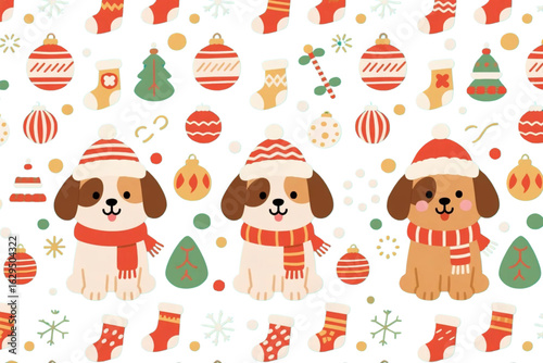 © KevinNandya, Obraz premium Christmas and Dogs patterns collection. Vector illustration of three flat seamless patterns with cute cartoon puppies in winter hats and scarfs, Christmas socks, balls, and other decor