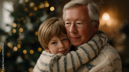 Obraz premium Christmas and generation alpha: Grandfather and grandson feel warmth of family bonds during special Christmas moment, hugging each other tenderly