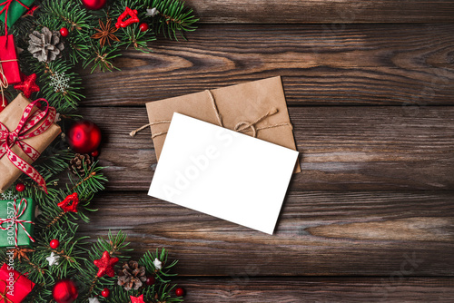 Fototapeta premium Christmas and Happy New Year greeting card with fir tree branches, gift...