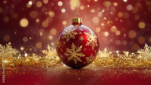 © Khadiza, Fototapeta premium Christmas and New Year banner in red ball and red golden glitter background