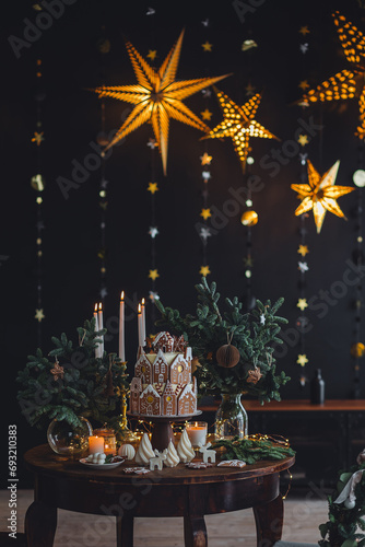 Fototapeta premium Christmas and New Year beautiful elegant family dinner table setting decorated with candles, fir tree branches, handmade craft toys. Gorgeous big homemade cake with gingerbread houses as centrepiece.