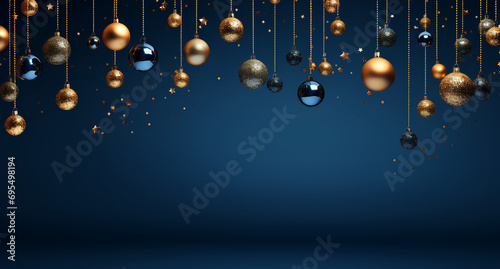 © Aleena, Obraz premium Christmas and New Year blue background with golden stars and christmas balls.