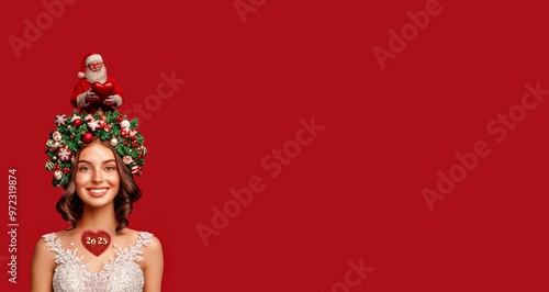 © Jadran Krnajski, Fototapeta premium Christmas and New Year card concept for sending best wishes. A beautiful smiling girl symbolizes the new year. Her hair is decorated decorations for the Christmas tree. There is also Santa Claus.