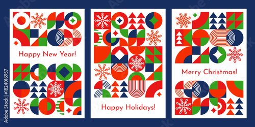 © Buch&Bee, Obraz premium Christmas and new year geometric vector posters. Red and green triangles, blue circles, semicircles, arches and snowflakes on Christmas minimalist geometric background. Vertical covers, holiday cards