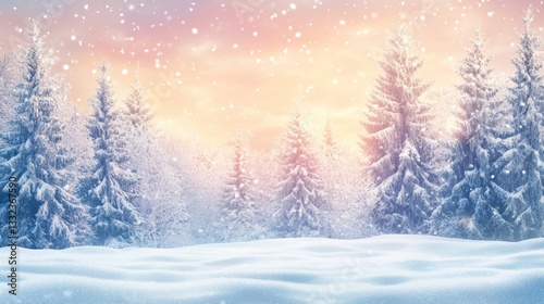 © Sona, Fototapeta premium Christmas and New Year greeting background with snowy winter landscape and trees.