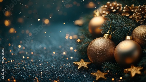Fototapeta premium Christmas and New Year holidays background. Christmas tree with golden baubles and lights bokeh background. Space for text. Copy space. Greeting card.