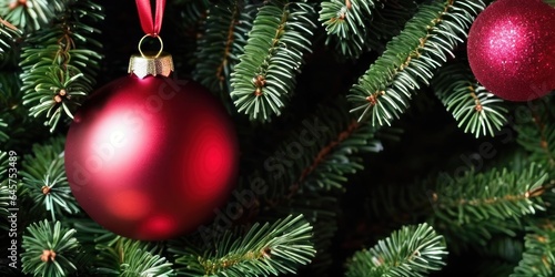 © useful pictures, Fototapeta premium Christmas and New years eve Background. Beautiful Wide Angle Holiday Template with Christmas ball on fir tree and highlights with copy space. Christmas and New year greeting card concept