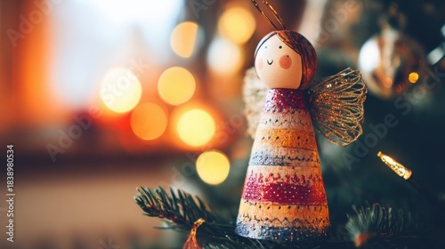 Fototapeta premium Christmas angel ornament on a tree with warm lights in background