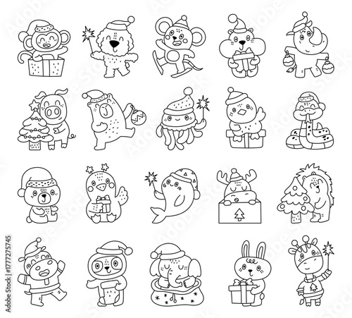 © Sergii Ieromin, Naklejka premium Christmas animal character set in outline line art showing cute emotions and poses with festive accessories perfect for winter celebration decoration holiday projects and cheerful designs